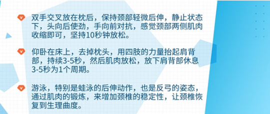 游泳,特别是蛙泳的后伸动作,也是反弓的姿态,通过肌肉的锻炼,来增加颈椎的稳定性,让颈椎恢复到生理曲度。